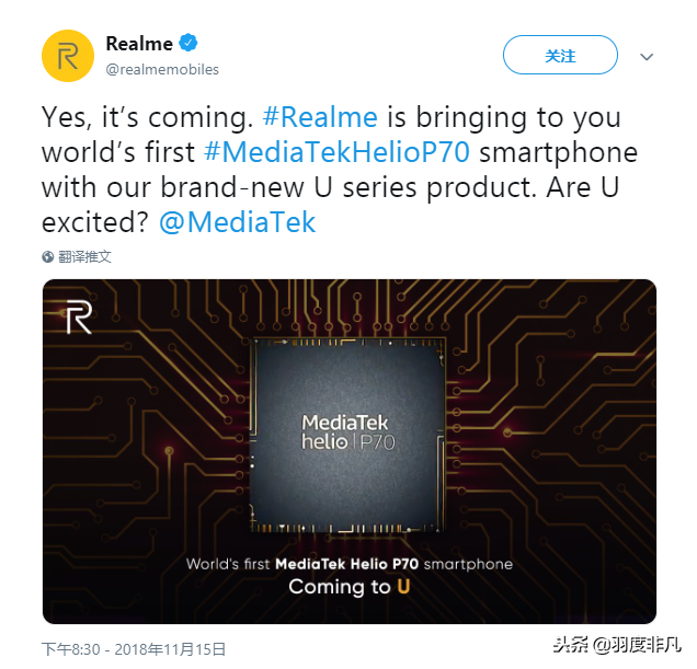 本以为先发Helio P70CPU的型号会是关键朝向国外销售市场的ELEPHONE型号,但现阶段ELEPHONE官方网尽管早已发布了配用Helio P70CPU的型号,但一直也没有宣布开售,而最近从OPPO摆脱出去的单独子知名品牌Realme在twiter公布信息,表明自己的U系列产品型号可能进行Helio P70CPU的全世界先发,而全新升级发布的U产品系列很有可能也是Realme专业对于MTKHelio P系列产品CPU量身定做打造出的,第一款配用Helio P70CPU的Realme U系列产品型号可能在11月28日宣布公布。